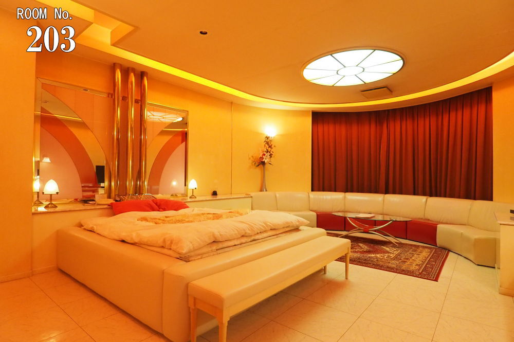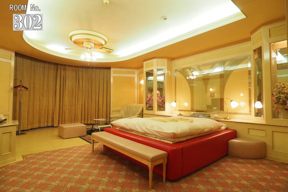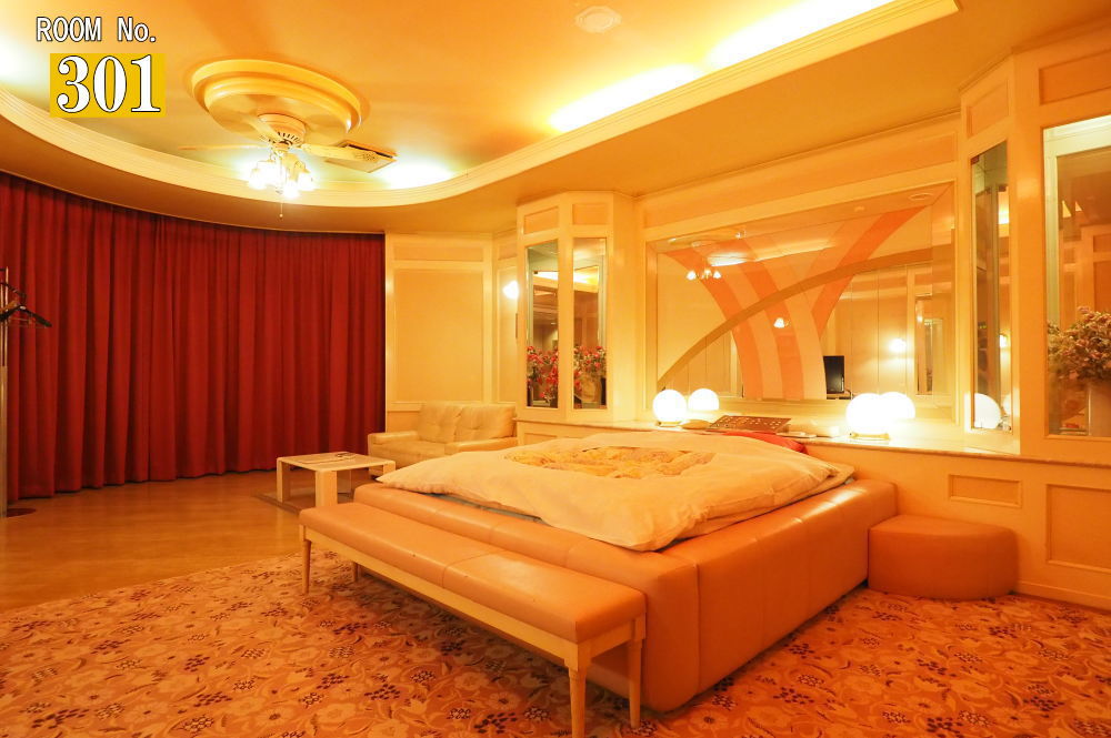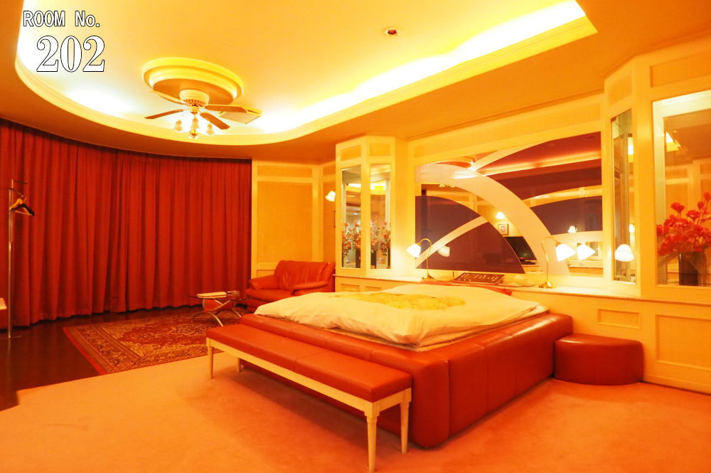 ●間接照明、絨毯、カーテン、ソファ、カラーミラー全部真紅、飾り棚だけが白の大理石、真紅ムードのお部屋です。